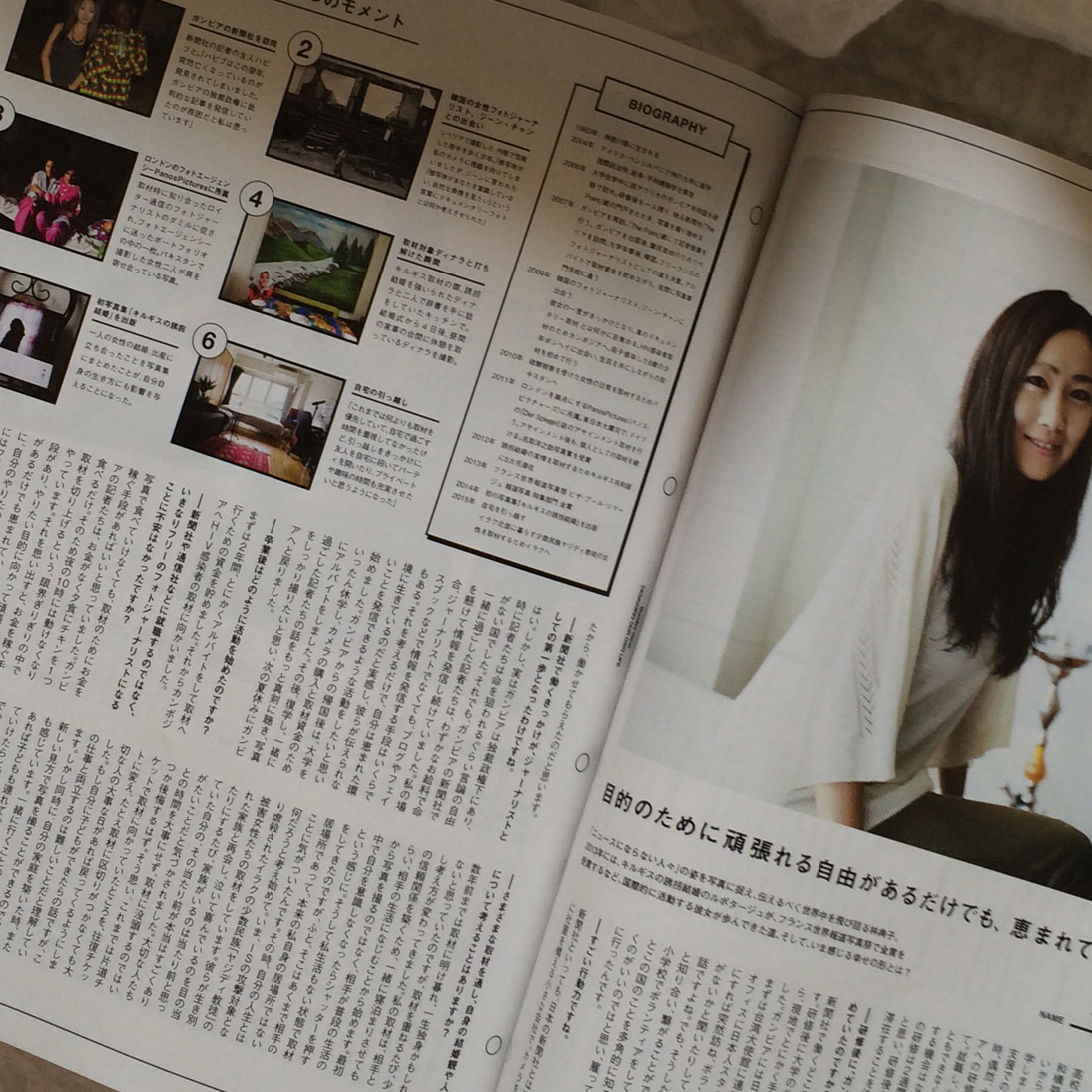 今月号のテーマは『地球は女で回っている』!だそう。私以外のページに映画監督の安藤桃子さんや建築家の永山裕子さんなど、子育てと仕事をしっかり両立しながら活動されている色々な職業の女性たちのインタビューがあり、とっても興味面白い内容でした。よろしかったら是非手に取ってみて下さい。